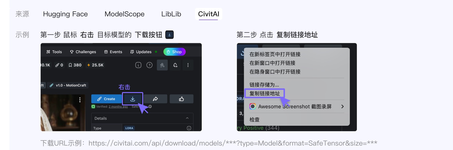 • 单个模型文件:直接粘贴模型文件链接,支持 HuggingFace、ModelScope、liblibAI、CivitAI。