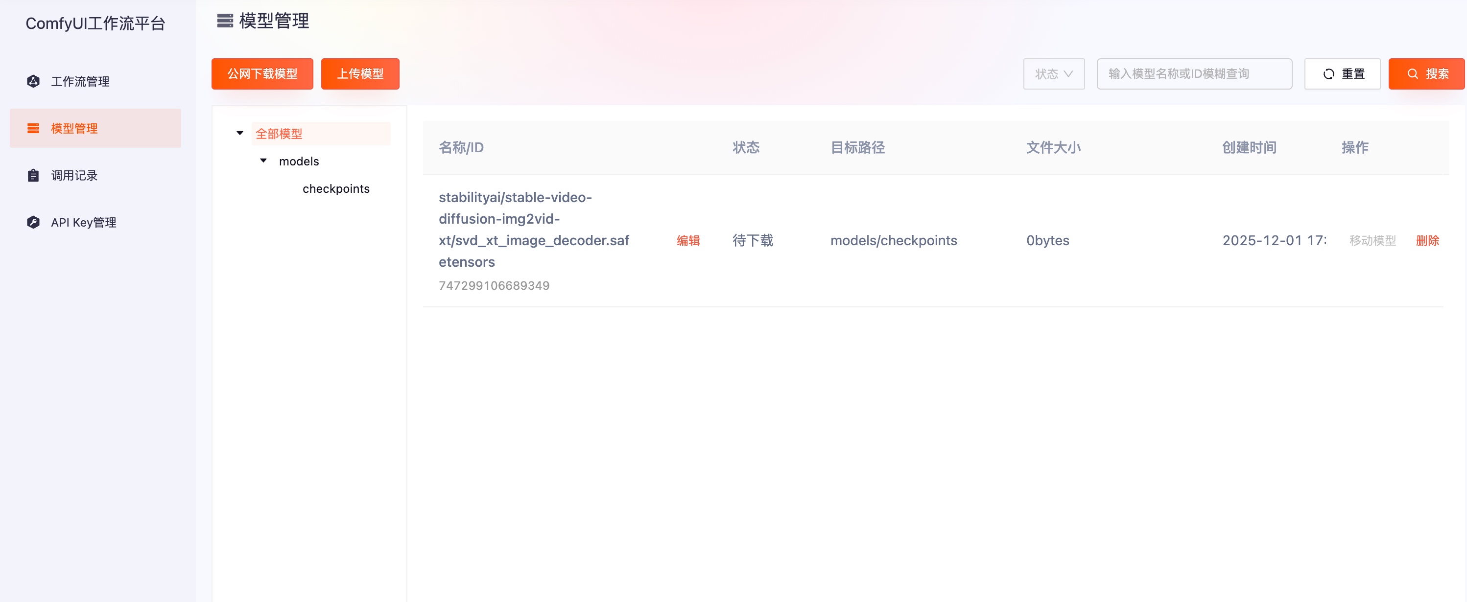 ComfyUI 工作流平台的「模型管理」功能提供了一个集中化平台,用于导入、组织和维护构建工作流所需的各类模型及相关文件。您可以从公网链接或本地导入单个模型文件乃至整个文件夹,系统会将这些资源整合到您的资产库中。通过提供层级化路径树和清晰的状态标识,您可以轻松地为私有环境配置所需的模型,确保模型资源的有序管理和在不同环境下的正确挂载。