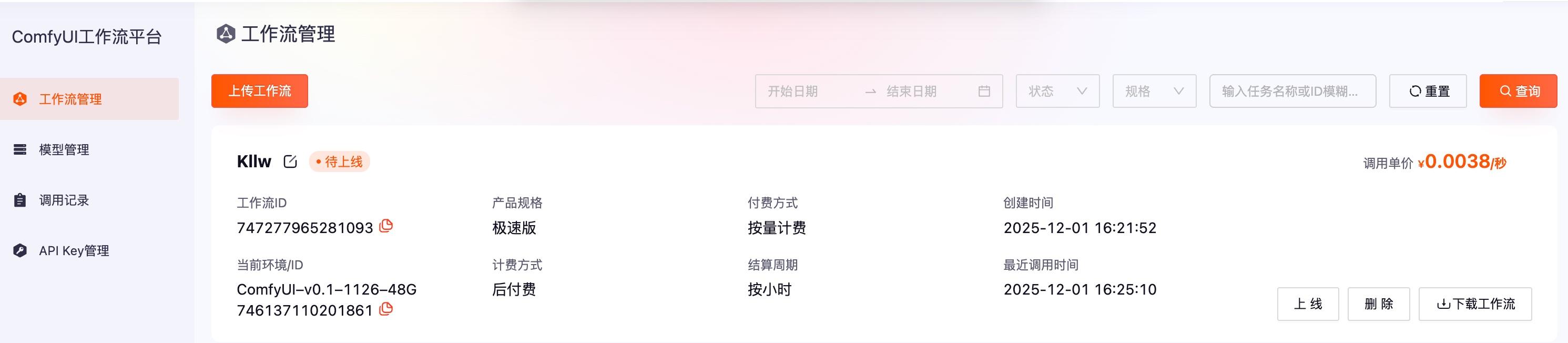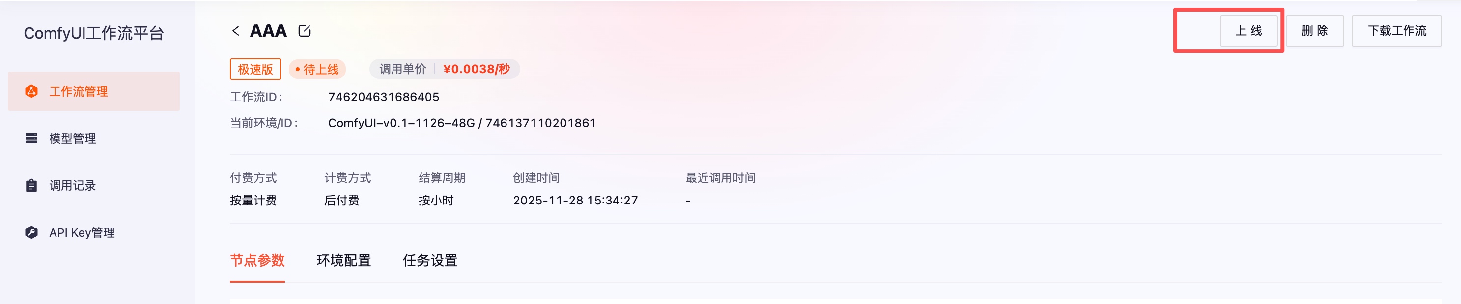 ComfyUI 工作流处于「已上线」状态时,表示该工作流已发布为生产可用的 API 服务。可尝试通过 API 提交生成任务,获取生图结果。