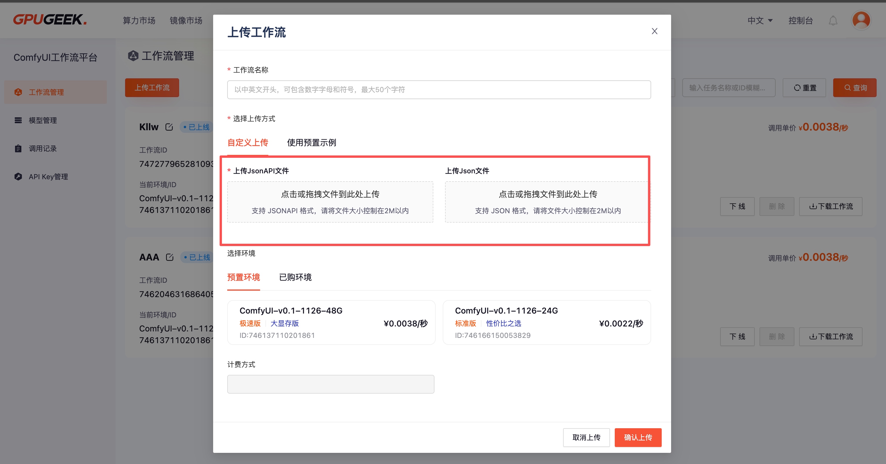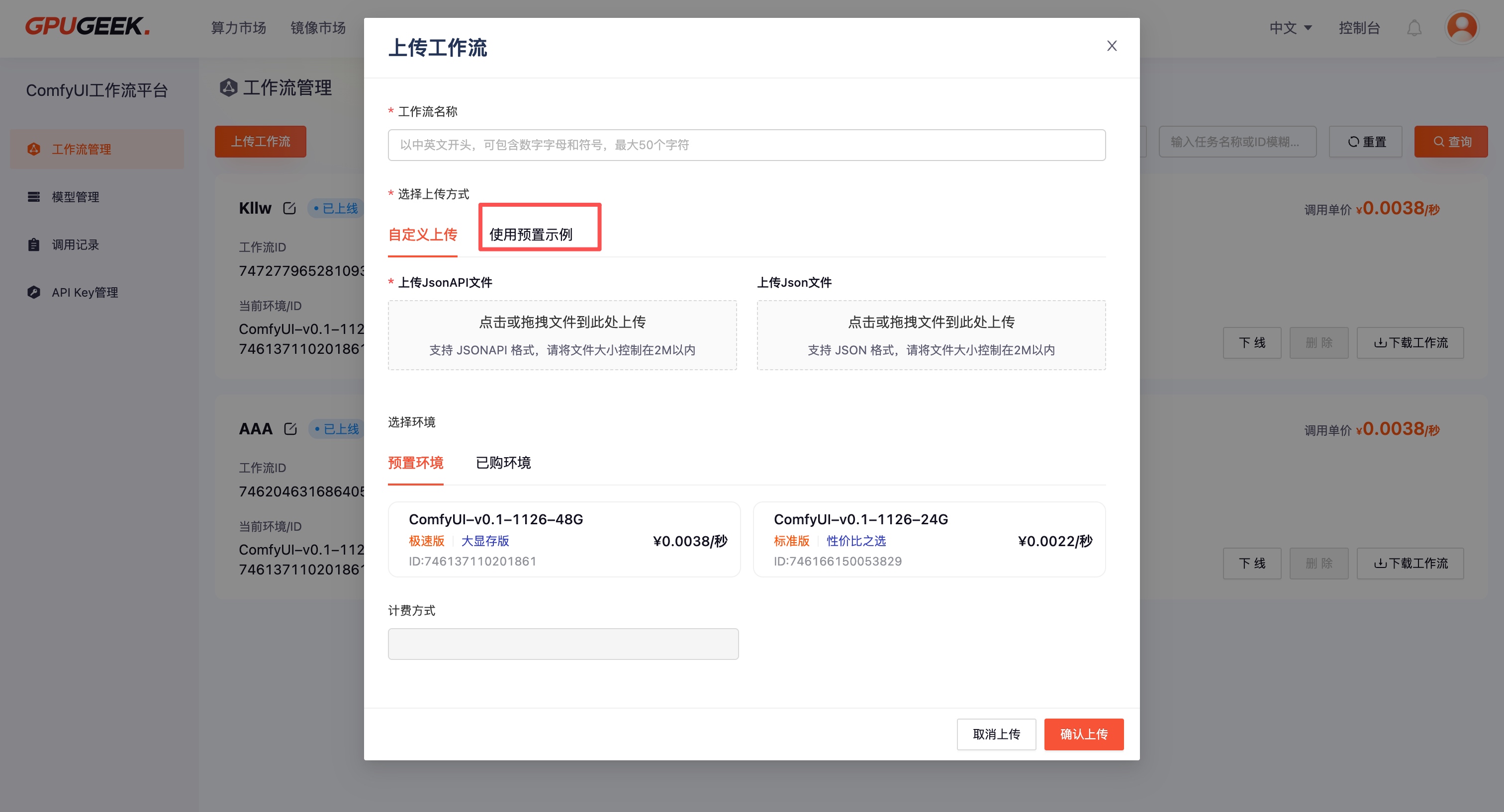 您无需上传自己的工作流文件,点击平台预置示例即可完成上传流程。