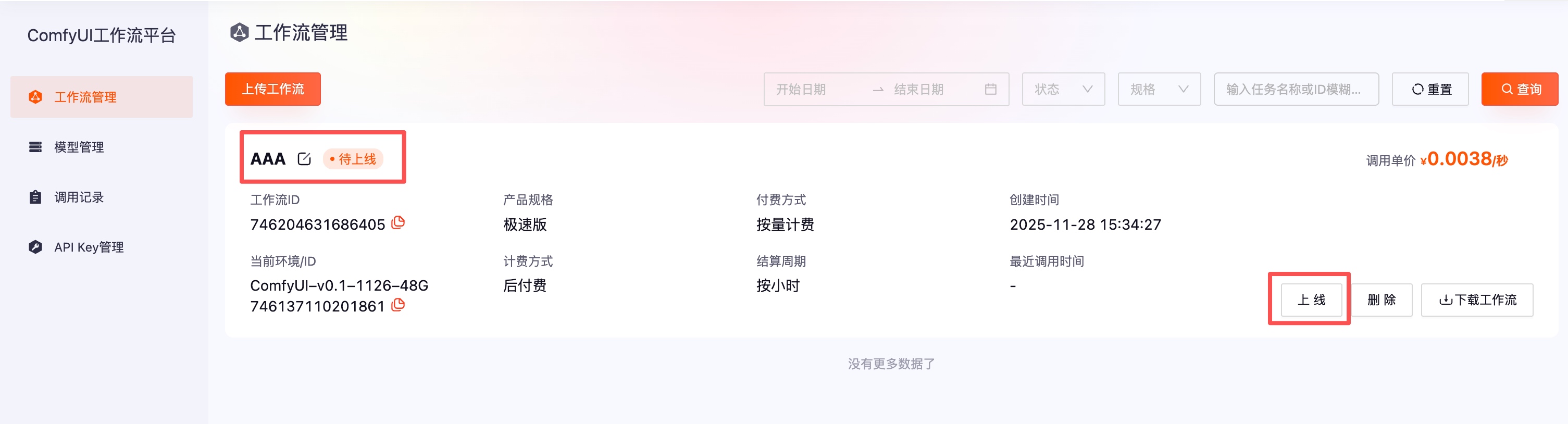 新建托管工作流后,工作流处于「待上线」状态,下一步需要关联工作流运行环境,上线等操作。