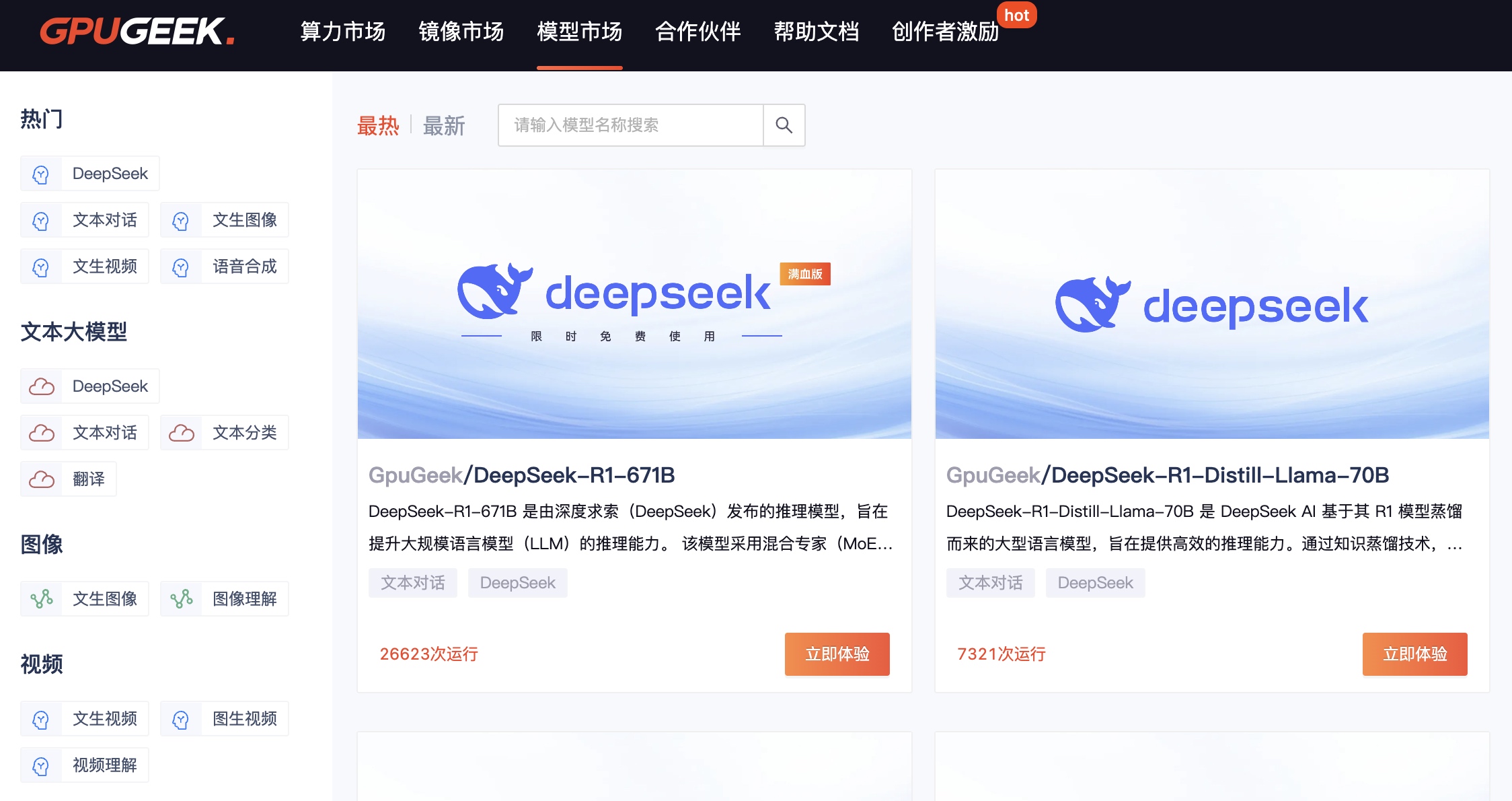 The Model Service is a full-process service launched by the GpuGeek platform, covering model creation, model push, model inference, and model deployment. In the Model Marketplace, you can conveniently call any public model through the interface or API, or publish your own models on the platform. For a more stable and efficient inference service, you can choose model deployment.
