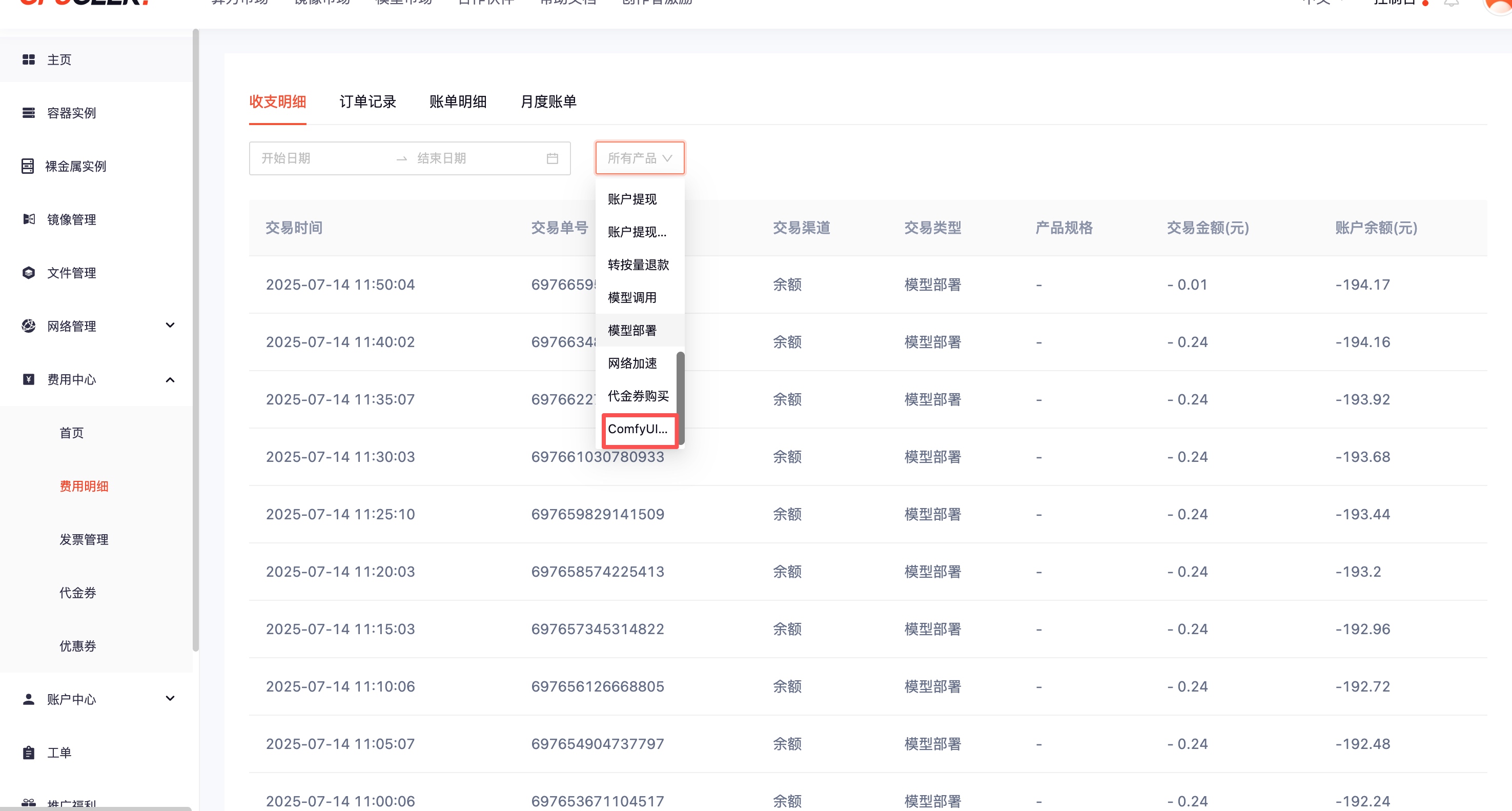 访问费用中心账单页面,切换到「明细账单」,产品名为「ComfyUI工作流调用」。