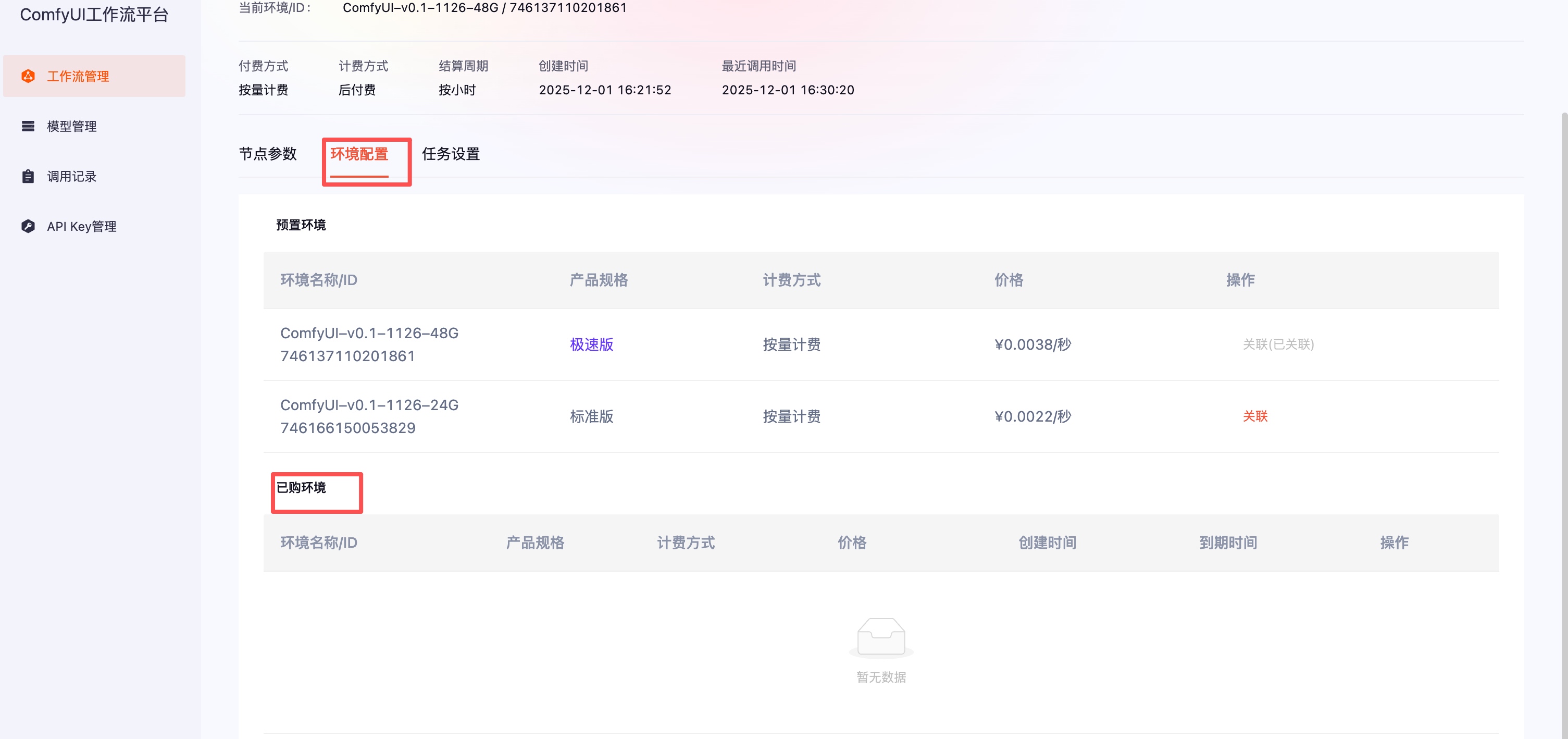 购买后,平台会为用户分配与并发数量对应的专属运行资源,使工作流能够在固定的并发额度内稳定执行。已购环境按并发数计费