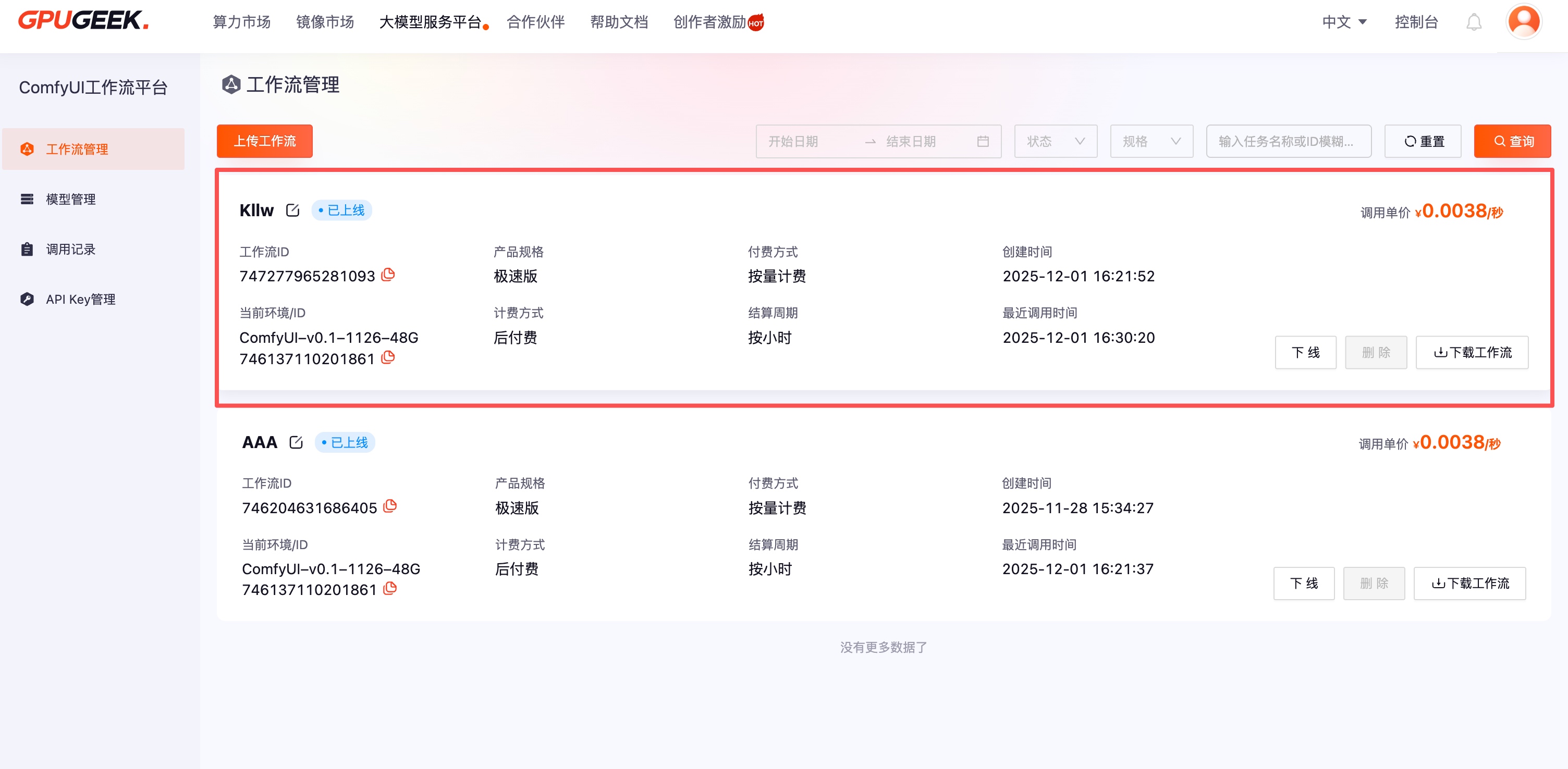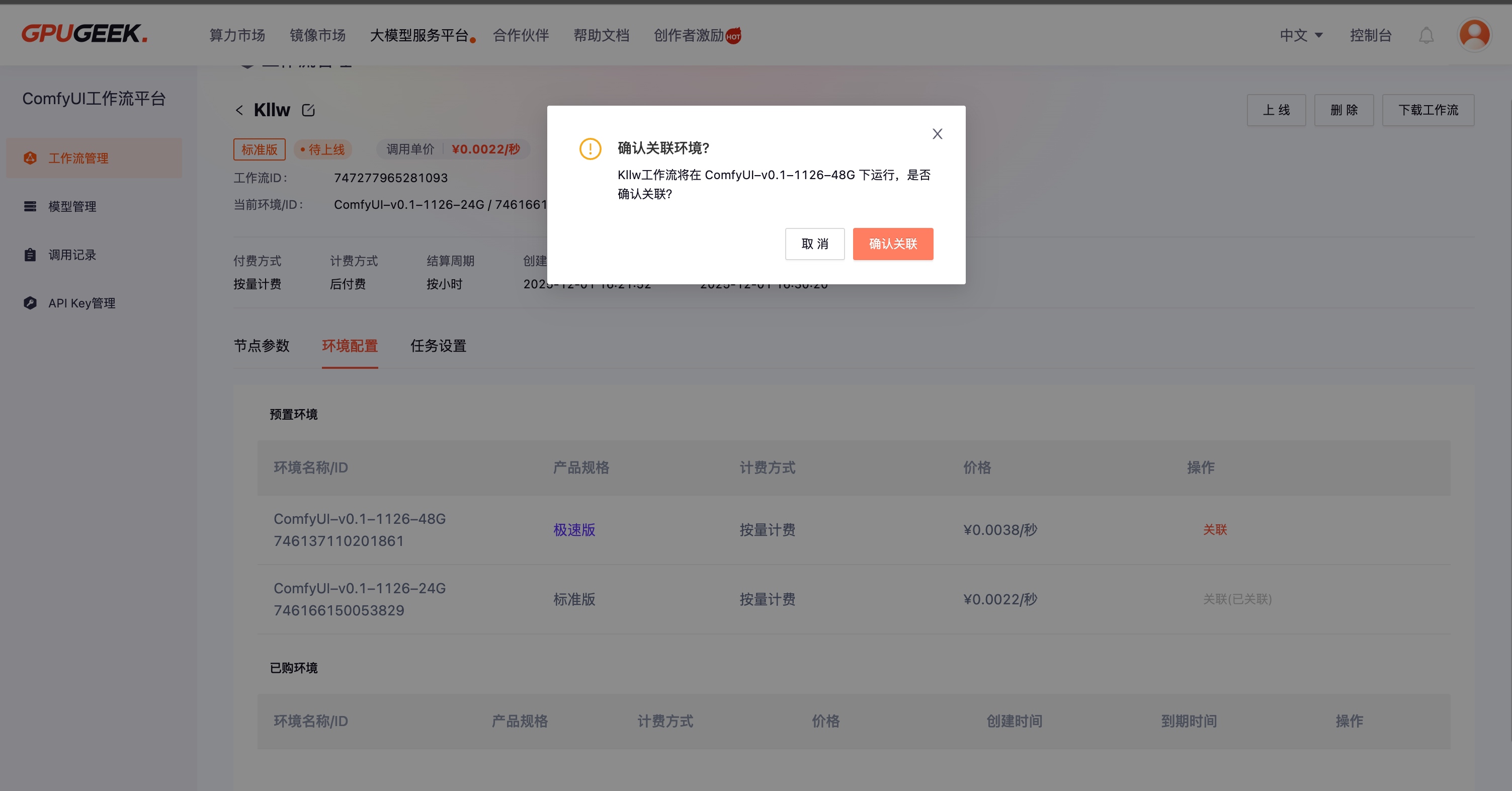 - 工作流与环境关联: 平台允许用户将环境(容器镜像)与特定的 ComfyUI 工作流进行关联。当用户运行工作流时,平台会自动在关联的容器环境中执行,确保工作流运行在预期的环境中。