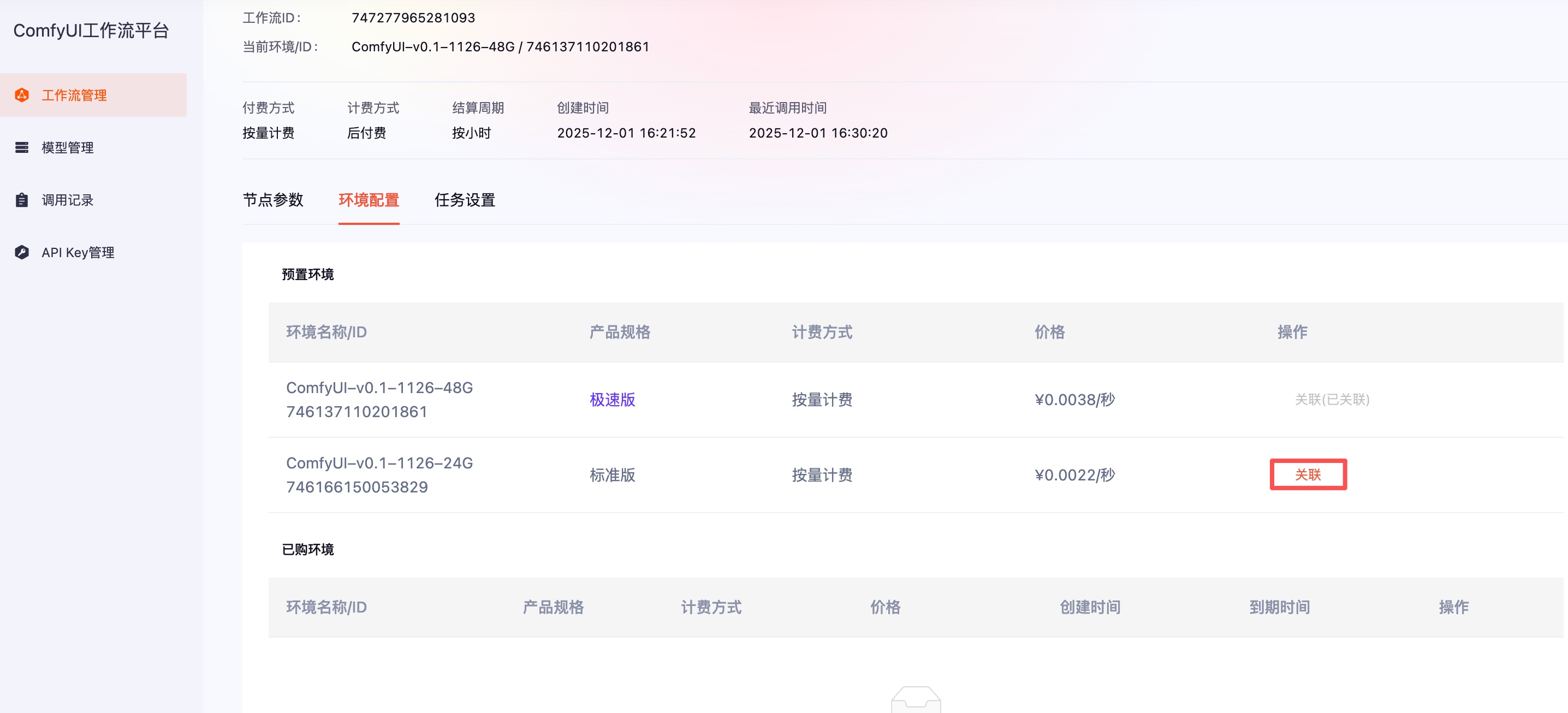 - 在「环境配置」标签页中,选择一个环境进行关联。平台会将比对工作流文件与目标运行环境中的模型、节点。