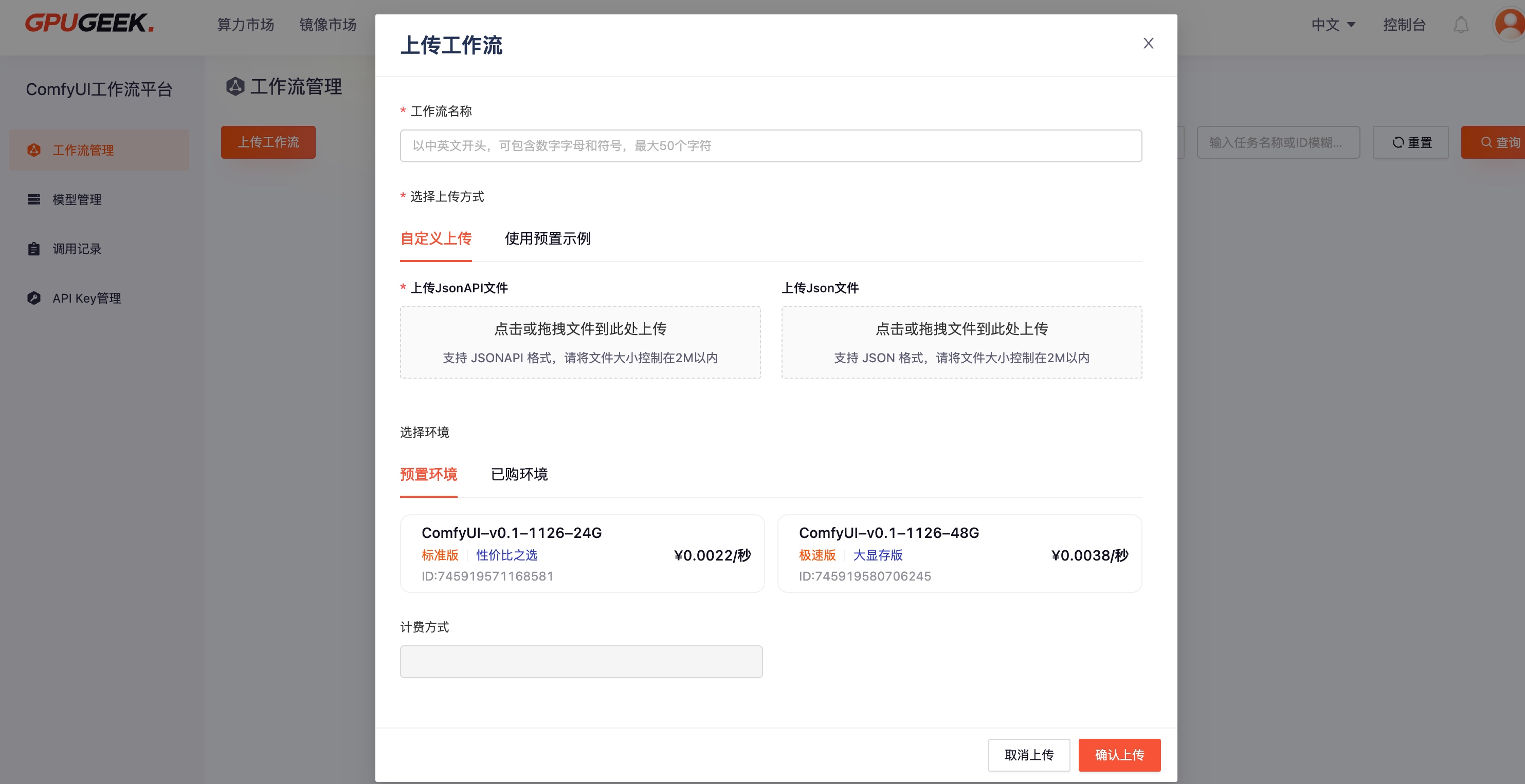 运行环境(必须) 上传工作流时,必须同时完成运行环境关联